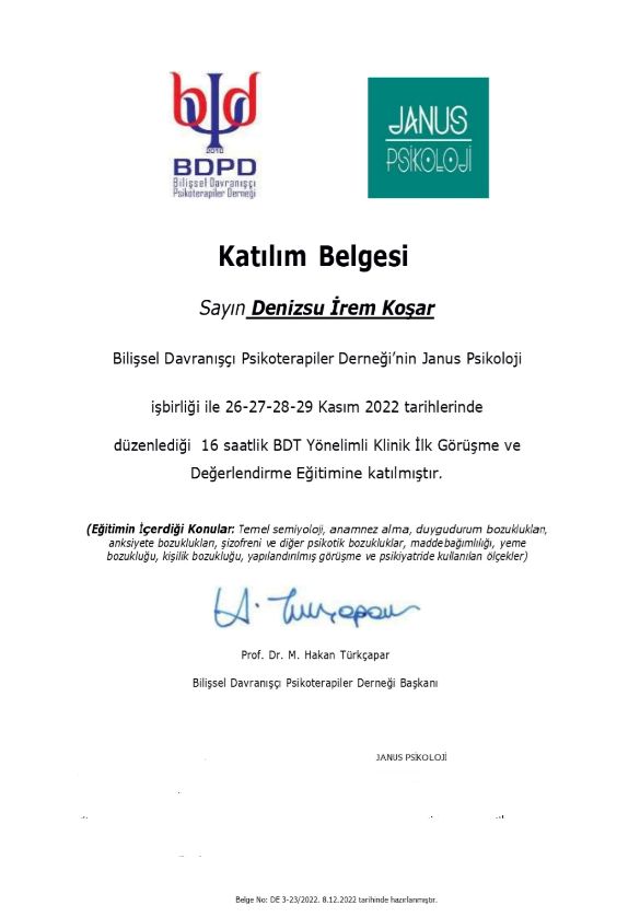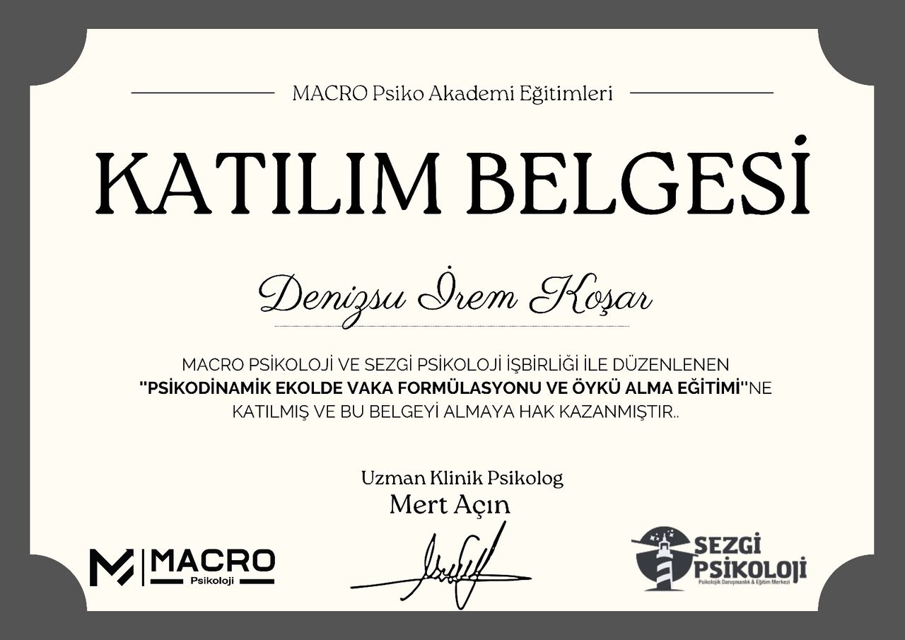 Psikoloji lisans eğitimini Doğu Akdeniz Üniversitesi’nde tamamlamıştır. Ardından İzmir Ekonomi Üniversitesi Klinik Psikoloji yüksek lisans programına kabul edilmiş, “Şefkat Korkusu ve Bitirilmemiş İşlerde Kendilik Nesnesi İhtiyaçlarının Rolü: Utanç ve Suçluluğun Aracılık Etkisi” başlıklı tezini başarıyla tamamlayarak mezun olmuştur. Yüksek lisans eğitimi boyunca psikodinamik ve varoluşçu kuramsal çerçevede danışan görmüş, süpervizyon altında vaka takibi yapmıştır. Halen süpervizyon eşliğinde klinik çalışmalarına devam etmektedir. Lisans ve yüksek lisans süreci boyunca farklı yaş gruplarıyla ve çeşitli psikoeğitim formatlarında grup çalışmaları yürütmüştür. Avrupa Psikoloji Öğrencileri Derneği (EFPSA) tarafından yürütülen eğitmenlik programını tamamlayarak uluslararası düzeyde deneyimsel öğrenme temelli eğitimler vermiştir. Türkçe ve İngilizce yürüttüğü bu grup çalışmalarında genç yetişkinlerden profesyonellere kadar geniş bir yelpazede katılımcılarla çalışmıştır. Klinik pratiğinde kişinin duygusal ihtiyaçlarını, kendilikle ilgili duygularını ve ilişkisel örüntülerini anlamayı merkezine alan bir yaklaşım benimsemektedir. Terapi sürecinde eklektik bir yönelimle; özellikle psikodinamik, varoluşçu ve hümanistik kuramların ilkelerini odağa alarak çalışmaktadır.
